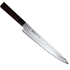 The blade is elongated and thinner than Gyutoh (butcher knife for meat) and is used primarily to cut apart large pieces of meat. This type can easily cut away meat with the tendons still intact when slicing the beef shank hung by a S hook. The Sujihiki knife’s true purpose extends further to dividing the meat through the tendons into blocks of a few kilograms. In restaurants, the more expensive the ingredient becomes, such as file mignon or sirloins, tendons that are hard to bite through are carved away in preparation. Since the blade is thin, it can cleanly remove the tendons without wasting any meat, preventing loss, which makes this knife an indispensable knife to professional chefs handling beef products.